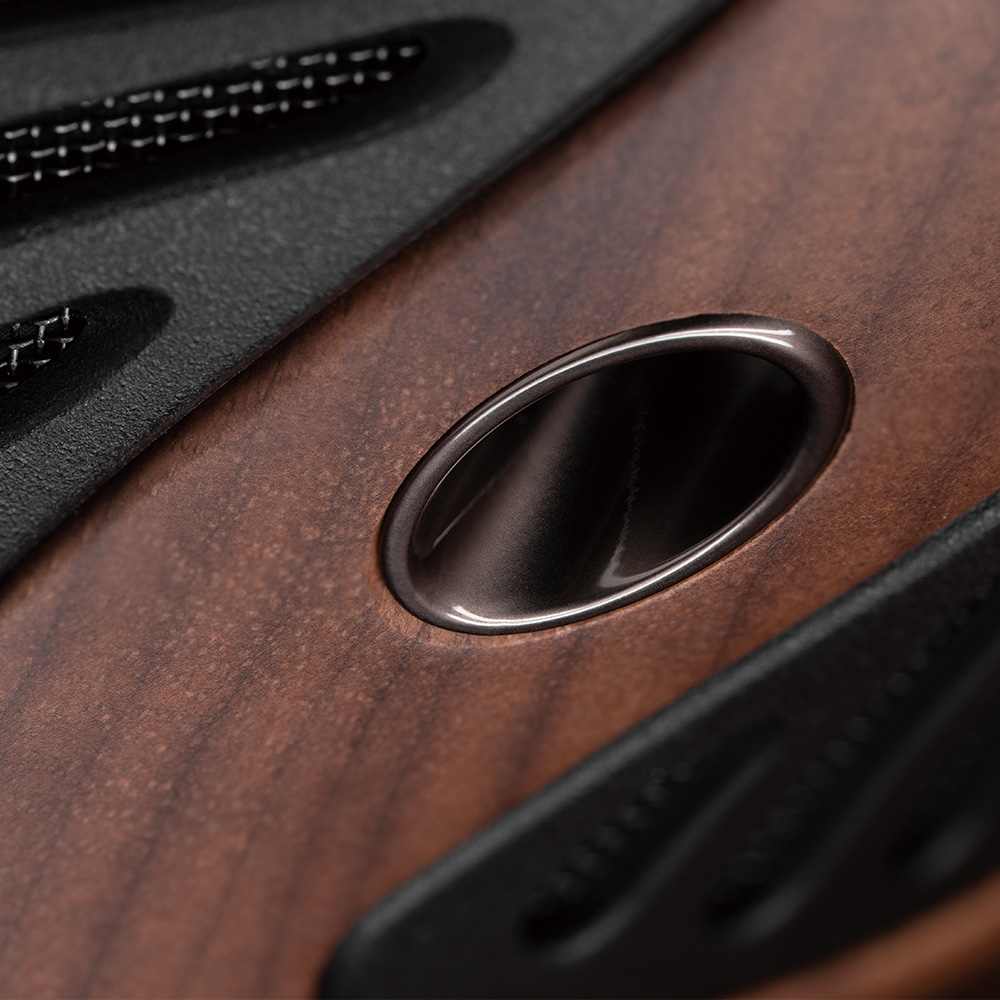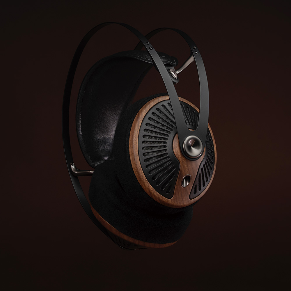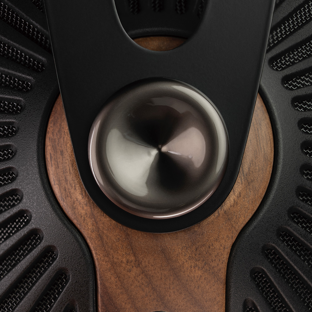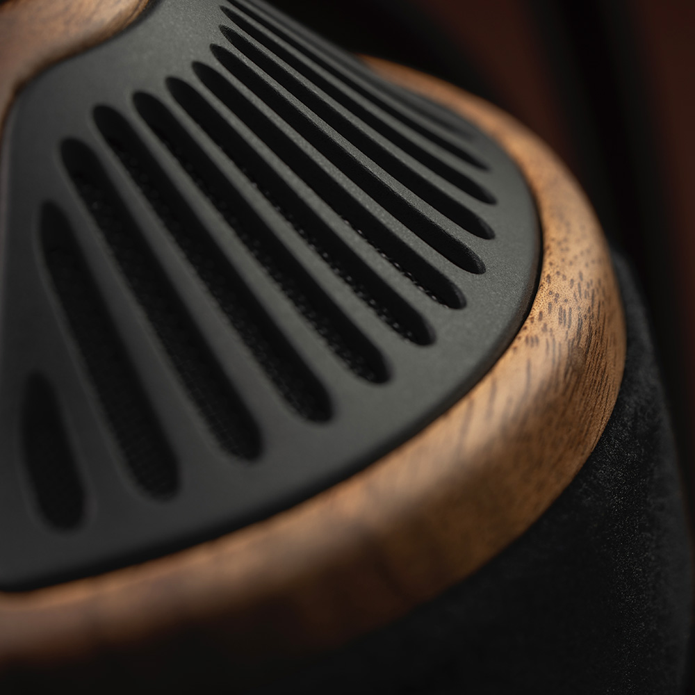 木のぬくもりが感じられるウォールナット材のイヤーカップと、放射状に広がるPC-ABSグリルが、見る角度によって表情を変え、いつまでも飽きのこない、特別な存在感を放ちます。