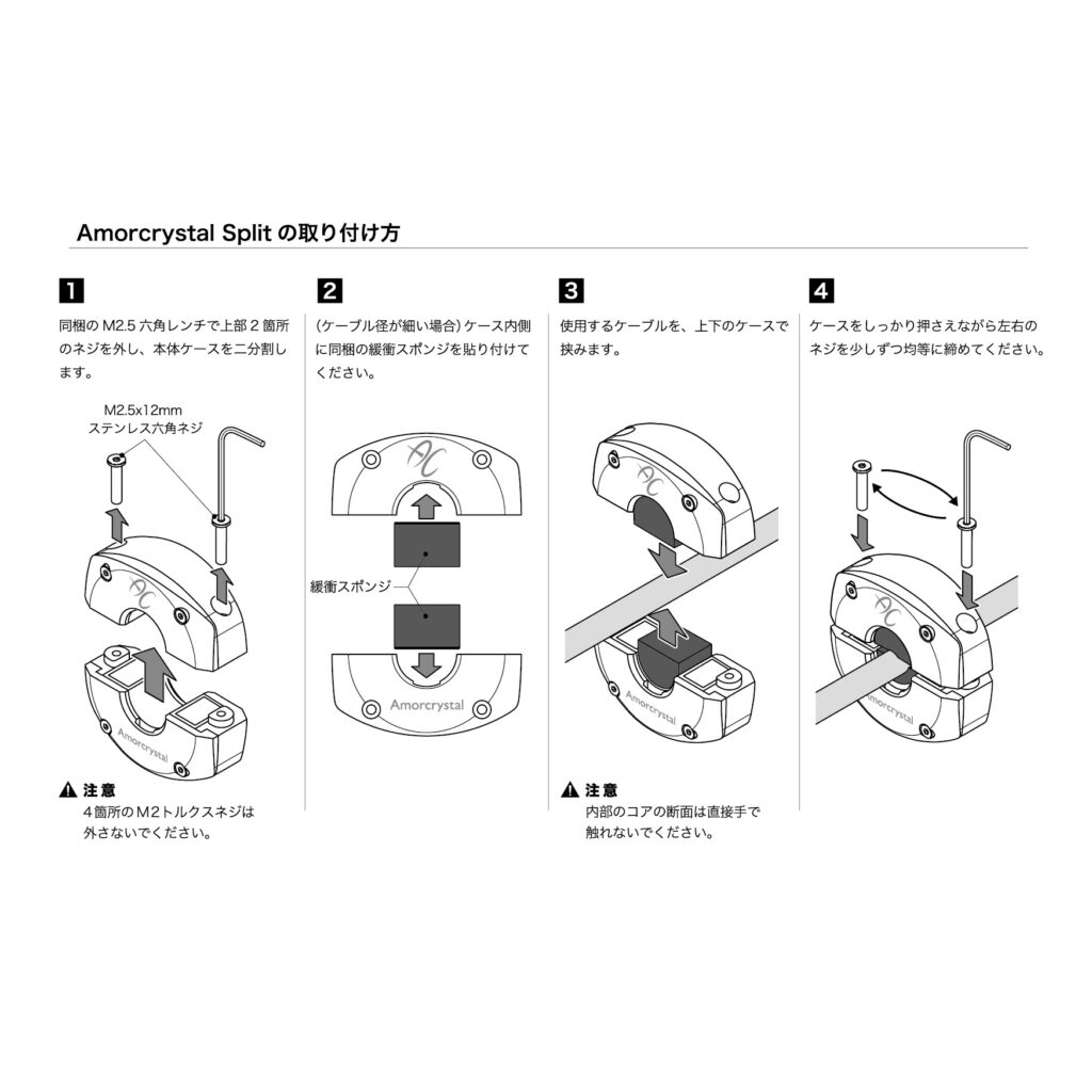 「Amorcrystal Split(for デジタル)」はケーブル直径14mm以内であれば誰でも容易に取り付けることができ、本機はデジタル機器用として開発されております。