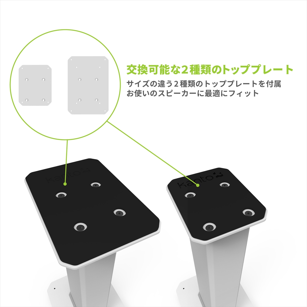 2種類のトッププレートを付属し、幅広いスピーカーサイズに対応。22インチと26インチ、30インチの3つの高さオプション、さらにブラックとホワイトの2色展開で、あらゆる空間と美的感覚にマッチします。